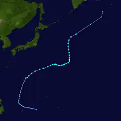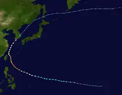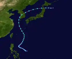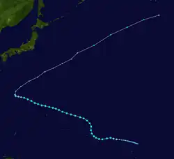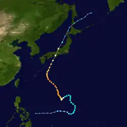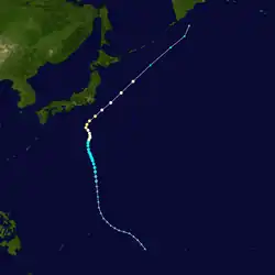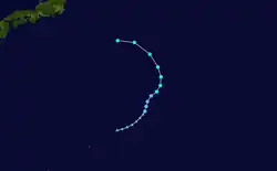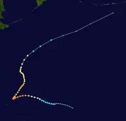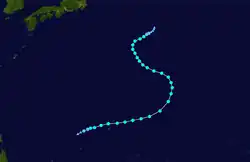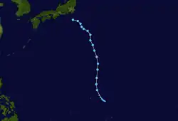 Page moved on a northwestward track for the next couple days while slowly strengthening.[11] Page was upgraded to a tropical storm by the JTWC late on May 12,[12] when it was located 500 kilometres (310 mi) north of Yap,[4] while the JMA first considered the system a tropical storm on May 13.[7] Late on May 13, Page suddenly slowed in forward speed and began turning to the northeast. On May 14, Page became a typhoon.[11][12] However, the JMA did not follow suit until 30 hours later.[7] Page reached its maximum intensity of 90 knots (170 km/h) and minimum pressure of 965 hectopascals (28.5 inHg) thirty hours after passing the point of recurvature.[11] Final warnings were issued by both the JTWC[11] and the JMA[7] early on May 18, as it began extratropical transition around 960 kilometres (600 mi) east-southeast of Tokyo.[11]