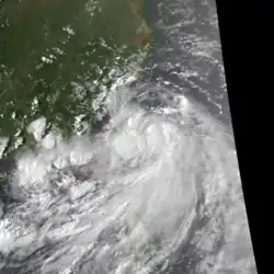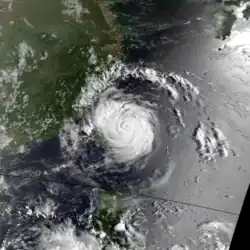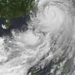 From July 9 to July 11, Tim and Tropical Storm Vanessa engaged in a Fujiwara interaction,[21] and Tim absorbed the smaller Vanessa into its southeastern quadrant.[22] Late on July 10, Tim struck Taiwan, bringing gusts of 98 knots (181 km/h) to Chenggong[21] as it made landfall about 200 kilometres (120 mi) south of Taipei.[1] Continuing northwest, Tim moved into mainland China as a weaker typhoon, crossing the coast about 150 kilometres (93 mi) south-southwest of Fuzhou. It dissipated well inland on July 11.[21]