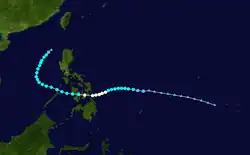 Owen continued to strengthen, with the JMA classifying it a severe tropical storm on April 3.[7] According to the JTWC, Owen reached typhoon intensity at the same time the JMA classified it a severe tropical storm. The storm tracked southwest to west-southwestward, and reached its peak intensity of 75 knots (139 km/h) from the JTWC (60 knots (110 km/h) from the JMA) on April 4, shortly before landfall between Leyte and Mindanao.[6] A reading taken late on April 3 at Guiuan on Samar reported sustained winds of 45 knots (83 km/h).[4] It weakened to a tropical storm overland, before it restrengthened slightly after emerging into the South China Sea. A drilling rig reported 50 knots (93 km/h) sustained winds. Soon afterwards, the cyclone dissipated over water northwest of Luzon on April 9.[6]