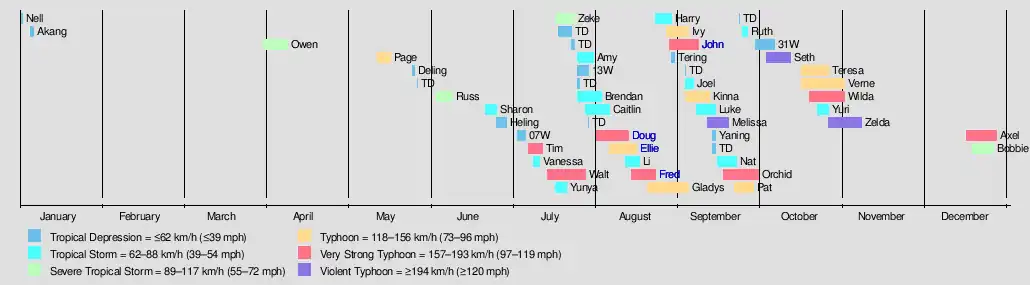 The season started on January 4 with the formation of Tropical Depression 01W to the west of Yap, with the first tropical storm developing a few months later on April 1, and ended near the end of the year when Tropical Storm Bobbie dissipated in the open Pacific on December 25. During the season, 25 systems either threatened land or made landfall, killing over 2,400 people. The strongest storm of the season was Super Typhoon Doug, which affected Taiwan, South Korea and mainland China, while the deadliest storm was Super Typhoon Fred, which killed over 1,000 people in China. Earlier in the season, the combined effects of two tropical storms —Russ and Sharon —caused flooding in China that killed over 1,400. The season also saw two storms, Li and John, cross into the Western North Pacific from the east, while one storm, Tropical Storm Yuri, formed from a precursor low that had similarly crossed the International Date Line. This season, PAGASA named 25 systems and had to use an auxiliary list to name some of them after running out of names from their standard list. Of the 25, three systems were not tracked by the Joint Typhoon Warning Center.
