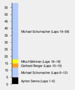 Schumacher took the lead on track on lap 12 when Berger ran wide, before relinquishing the race lead overall to Berger when he made his first pit stop, confirming that his pace both before and after the red flag was down to his running a three-stop strategy, therefore racing with a lighter car. Berger made a pit stop at the end of lap 15 for his first of two scheduled stops, before retiring a lap later with handling problems. Mika Häkkinen led his first ever laps of a Formula One World Championship race, before he made a pit stop at the conclusion of lap 18. Following the first series of pit stops, Schumacher resumed the race lead on aggregate, overtaking Nicola Larini on track at Tosa. Schumacher's extra pace as a result of his lighter fuel loads meant he was able to pull out enough of a gap to Häkkinen which enabled him to make an extra pit stop. Häkkinen's pace was very slow, allowing Larini to leapfrog him when drivers who planned to make two pit stops made their final pit stops.[32]