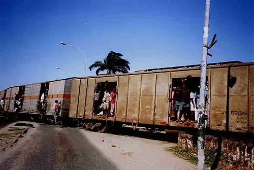 ![]() Example of a 1990s Benguela railway freight train with fare-dodgers | |