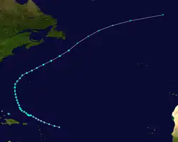 The storm posed a significant threat to Bermuda, warranting a hurricane warning between August 14 and August 15. During the latter date, Felix passed only 75 mi (121 km) to the southwest of the island. Continuing on its northwest trek, the cyclone also temporarily prompted preparations along the East Coast of the United States. However, the storm curved northward and then east-northeastward while remaining offshore. Felix briefly threatened Bermuda again, but turned back to the northeast and weakened to a tropical storm on August 20. It accelerated east-northeastward and passed a short distance offshore of Newfoundland, where it transitioned into an extratropical storm on August 22. The remnants of Felix continued northeastward across the Atlantic until dissipating near Shetland on August 25.[38]