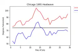 The July 1995 Chicago heat wave led to 739 heat-related deaths in Chicago over a period of five days.[1] Most of the victims of the heat wave were elderly poor residents of the city, who did not have air conditioning, or had air conditioning but could not afford to turn it on, and did not open windows or sleep outside for fear of crime.[2] The heat wave also heavily impacted the wider Midwestern region, with additional deaths in both St. Louis, Missouri[3] and Milwaukee, Wisconsin.[4]