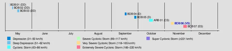 | BOB 06 | November 7–11 | Very severe cyclonic storm | 120 km/h (75 mph) | 984 hPa (29.06 inHg) | India, Bangladesh, Nepal | $46.3 million | 236 | |