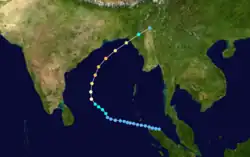 An area of convection blossomed near northern Sumatra on November 18,[3] associated with the monsoon. Aided by the same westerly wind burst that assisted Cyclone Daryl in the Southern Hemisphere, the disturbance gradually organized and persisted while moving west-northwestward through the Bay of Bengal.[3][20] Late on November 21, the system developed into a depression,[2] which the JTWC classified as Tropical Cyclone 04B. Steady intensification ensued; by November 23, the JTWC upgraded the cyclone to the equivalent of a minimal hurricane,[3] and the IMD steadily upgraded the storm to increasing categories.[2] The storm turned to the north and northeast around a ridge, accelerating toward land. At 06:00 UTC on November 24, the JTWC estimated peak 1 minute winds of 195 km/h (120 mph).[3] Shortly thereafter, the IMD estimated peak 3 minute winds of 190 km/h (120 mph), making the system an extremely severe cyclonic storm. By that time, the system had a well-defined eye in the center of deep convection with an eye temperature of -8.7 °C, warmest in North Indian Ocean. Due to increasing wind shear, the storm weakened and made landfall over southeastern Bangladesh with winds of around 120 km/h (75 mph), south of Cox's Bazar around 09:00 UTC on November 25. A few hours later, the system degenerated into a remnant low over northern Myanmar.[2]
