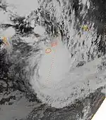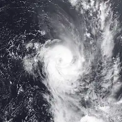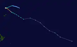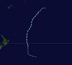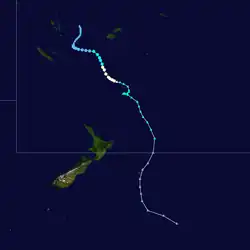 On February 23, a depression formed near the Southern Cook Islands and gradually developed further over the next couple of days, as it moved south-westwards over the open seas.[18] On February 25, the system moved into MetService's area of responsibility where it started to bear the hallmarks of a tropical cyclone and thus MetService discussed the possibility of naming the system with the FMS.[18] At the time there was no precedent of a tropical cyclone being named in the South Pacific while located to the south of 25°S and nobody knew if MetService should take a name from the FMS list of names for the region or make one up.[18] As a result, it was decided to treat the system as a depression operationally, before it was classified as an unnamed tropical cyclone in post-analysis.[18] At around 15:00 UTC+12 (03:00 UTC) on February 26, visible satellite imagery showed that the system had developed a ragged eye, which suggested that the system was at or near hurricane strength.[18] 3 hours later, the "Capitaine Tasman" encountered the system and recorded 10-minute sustained winds of 110 km/h (70 mph) near the centre, which made it a category 2 tropical cyclone on the Australian Scale.[18] Later that day, the NPMOC initiated advisories on the system, designated it as Tropical Cyclone 29P and estimated peak 1-minute sustained windspeeds of 85 km/h (50 mph).[7]