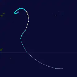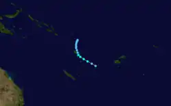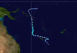 On April 12, after analysing reports from various weather stations in the region, the FMS reported that a circulation had developed within a monsoon trough in the area between Rotuma and the Santa Cruz Islands.[32] Over the next few days, the circulation developed into a tropical depression, as it moved southeastwards parallel to the islands of Vanuatu, under the influence of a subtropical ridge of high pressure.[32][33] During April 17, the JTWC initiated advisories on the system and designated it as Tropical Cyclone 34P, before the FMS named it Ian after it had become a category 1 tropical cyclone on the Australian scale.[32][34]