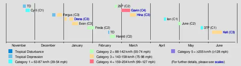 Significant tropical cyclones during the season included Fergus and Drena, which both impacted the island nations of Vanuatu, New Caledonia and New Zealand. Severe Tropical Cyclone Gavin was the strongest tropical cyclone and impacted the island nations of Tuvalu, Fiji, New Zealand, Wallis and Futuna. Severe Tropical Cyclone Hina subsequently became the worst tropical cyclone to affect the South Pacific island nation of Tonga since Cyclone Isaac in 1982. Three tropical cyclones developed after the season ended on April 30, including Severe Tropical Cyclone Keli which became the first recorded post-season tropical cyclone to form in June within the South Pacific Ocean.[8][9] The names Drena, Fergus, Gavin, Hina and Keli were subsequently retired, by the World Meteorological Organization's RA V Tropical Cyclone Committee.[10]