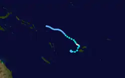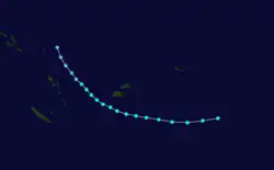 During May 26, the JTWC started monitoring a tropical disturbance that had developed to the southeast of the Solomon Islands, in response to strong westerly winds along the equator.[8][41] Over the next two days the disturbance gradually developed further, before the JTWC initiated advisories on the system and designated it as Tropical Cyclone 37P during May 28.[37] During the next day the system moved towards the south-southeast, before it peaked with 1-minute sustained wind speeds of 65 km/h (40 mph).[8] During May 30, the system dissipated as a significant tropical cyclone, after it had encountered cooler waters and stronger vertical windshear.[8][42]