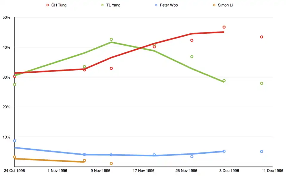 In August 1996, public opinion polls showed Anson Chan had the most popular support, having more than 50% far ahead of Tung Chee-hwa's 5%. After Chan was dropped from the polling, Ti-liang Yang surged into the lead. Tung kept catching up in the polls in the later stage. In an opinion survey published on 2 December, 46% of the respondents said they preferred Tung, compared to 28% for Yang and 5.2% for Peter Woo.