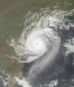 Ahead of the storm, about 225,000 families evacuated,[1] although many towns lacked proper storm shelters.[34] When the cyclone made landfall, it produced strong winds up to 100 km (62 mi) inland, dropped 210 mm (8.3 in) of rainfall across a 40 km (25 mi) region, and flooded over 250 villages along 60 km (37 mi) portion of the coast.[1][35] About 70% of the overall damage was in East Godavari district,[36] where two villages were entirely destroyed.[1] The storm destroyed 241,802 ha (597,510 acres) of crops and killed millions of cattle and chicken.[1][37] Across Andhra Pradesh, the storm damaged 647,554 houses, including over 10,000 that were destroyed. Overall damage totaled RS$21.5 billion (US$602 million),[1] comparable to a cyclone in 1977 that also hit Andhra Pradesh.[38] There were 1,077 confirmed deaths with many others missing, although many of the dead were washed into the sea and were unlikely to be found.[1] After the storm, the government and local Red Cross chapters helped residents recover from the damage,[36] while the World Bank provided money to better prepare Andhra Pradesh for future storms.[39]