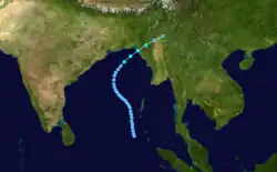 In early May, a westerly wind burst spawned two disturbances on both sides of the equator in the eastern Indian Ocean, in association with the monsoon trough. The system in the southern hemisphere eventually became Tropical Storm Jenna, while the system in the northern hemisphere developed an area of convection about 445 km (277 mi) northwest of Sumatra. This disturbance moved generally northward,[3] and initially remained disorganized; the thunderstorms were removed from the circulation.[8] However, the JTWC issued a Tropical Cyclone Formation Alert (TCFA) on May 5 once the system became better organized amid low wind shear. Rounding the periphery of a ridge, the system turned to the northeast. Based on the appearance on satellite imagery, the JTWC classified the system as Tropical Cyclone 01B at 00:00 UTC on May 7.[3] Three hours later, the IMD classified the system as a depression about 400 km (250 mi) south of Kolkata.[1] The storm intensified further while moving toward southeastern Bangladesh. The JTWC upgraded it to a 75 km/h (45 mph) tropical storm,[3] while the IMD upgraded it to a deep depression.[1] Around 00:00 UTC on May 8, the storm made landfall along Cox's Bazar District. Quickly weakening over land, the system dissipated over northern Myanmar later that day.[3]