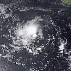 On May 15 an area of disturbed weather in the Intertropical Convergence Zone developed into a tropical depression. The disturbance was not readily traceable back to a tropical wave from the Atlantic. On its first day of its existence, Tropical Depression Two-E was a well-organized system with maximum sustained winds of 35 mph (56 km/h) and a minimum central pressure of 1,006 mbar (29.7 inHg).[15] As it slowly moved west, Two-E experienced a few intermittent bursts of convection. However, the depression gradually became less organized during the remainder of its life. On May 18, the cyclone's organization deteriorated markedly until it dissipated the next morning.