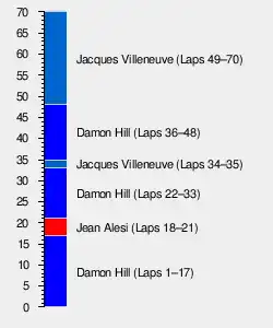 Williams' Jacques Villeneuve won the race from team-mate Damon Hill and Ferrari's Michael Schumacher, having overtaken the latter on the outside of the final corner while the two were lapping the slow-moving back-marking Minardi of Giovanni Lavaggi (who at the time was described by BBC TV commentator Jonathan Palmer as "desperately slow" and "there because of his money"). This victory, Villeneuve's fourth of the season, ensured that the Drivers' Championship battle between him and Hill went to the final round in Japan three weeks later.