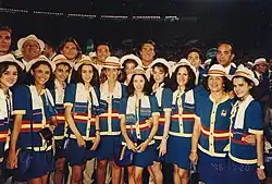 The Artistic portion of the ceremony began and first up was a rousing number called "Welcome to the World," composed by songwriting team Jimmy Jam and Terry Lewis.[7] This was an over the top number featuring cheerleaders, marching bands, and steppers, as all activities originated in the United States. They performed a montage of southern culture in the deep south including the college sporting culture as well as performing an all-American party. The audience also participated as they performed the wave. Assisting the cast were chromed Chevrolet pick-up trucks a nod the U.S. auto industry with spotlights in the beds. The segment ended with a fireworks display.