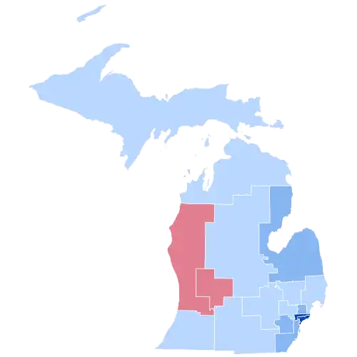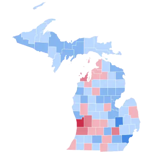 As of the 2024 presidential election, this is the last election in which Houghton, Alcona, Cheboygan, Crawford, Dickinson, Kalkaska, Luce, Mackinac, Mecosta, Lapeer, Keweenaw, Montcalm, Tuscola, Branch, Baraga, Chippewa, Huron, Wexford, Osceola, Montmorency, and Oscoda Counties voted for a Democratic presidential candidate. This is also the last time all counties in the Upper Peninsula voted for a Democrat.[3]