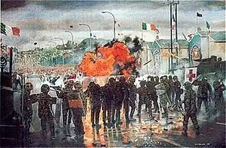 ![]() "Drumcree, The Garvaghy Road July 1997" by military artist David Rowlands, oil on canvas, 91cm x 61 cm, painting owned by the 1st Battalion (The Cheshires) The Mercian Regiment which depicts British soldiers during the rioting on Garvaghy Road[1] | |||||||