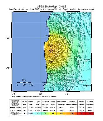 The 1997 Punitaqui earthquake occurred at 01:03 UTC on October 15. It had an estimated magnitude of 7.1 Mwc. This earthquake was one of the most destructive in the epicentral area compared to other events of subduction of the same size. The extensive damage to structures was the result of an amplification effect on the ground and the poor quality of building materials, this reflects the potential for damage incurred in an intraplate earthquake with vertical fault and how it can be much greater than what which can cause one of interplate of similar magnitude, and caused severe damage in Chilean cities of La Serena, Vicuña, Ovalle, Illapel and Punitaqui.[1]