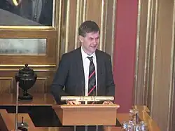 The first day was dominated by Erik Solheim and his resignation. Solheim used is time talking about what he called "future socialism", which according to him would mean more individualism and a more modern approach within the party. Kristin Halvorsen was elected new party leader that day. The Norwegian media also noted his "dominant presence" at the convention could be a sign of the party's complicated relations with him; because of his more reformist stance on multiple subjects.[7] Then sitting Prime Minister of Norway Thorbjørn Jagland believed that the leader change within the party would not change the Socialist Left's relationship with the Labour Party's. Believing that both Solheim and Halvorsen held the same beliefs, even if Solheim was more of a "theoretician" then a "practician" as Halvorsen was.[8] Hans Ebbing left the party's Central Board in protest of the election of Halvorsen, sharing the same belief as Jagland that she would continuing in reforming the party and moving away from traditional socialist beliefs. This incident was seen as "childish" by both the right-wing faction of the party and the media.[9]