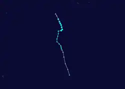 Over the next 3 days, Hali moved towards the west as it gradually intensified further, before early on March 16, an approaching upper trough of low pressure caused a weakness in the subtropical ridge.[1][10] As a result, the cyclone started to move towards the south, while the FMS reported that Hali had reached its 10-minute peak windspeeds of 120 km/h (75 mph), which made it a category 3 severe tropical cyclone on the Australian scale.[7][10] Later that day the FMS reported that the cyclone had started to rapidly weaken because of increasing vertical windshear and cooler sea surface temperatures, and interference from Tropical Depression 20F.[1][8] As a result, the FMS reported at 1200 UTC on January 18, that Hali had weakened into a depression before later that day the cyclone got caught up in the low level steering field and drifted into TCWC Wellington's area of responsibility during the next day.[11] The remnants of Hali were then last noted during March 20, as they dissipated about 1,200 km (745 mi) to the southeast of Avarua on the Southern Cook Island: Rarotonga.[7][2]