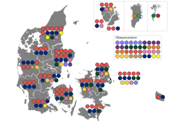 Venstre leader Uffe Ellemann-Jensen resigned as party leader a few days after the election. The new Danish People's Party made a successful electoral debut. Voter turnout was 85.9% in Denmark proper, 66.1% in the Faroe Islands and 63.2% in Greenland.[2]