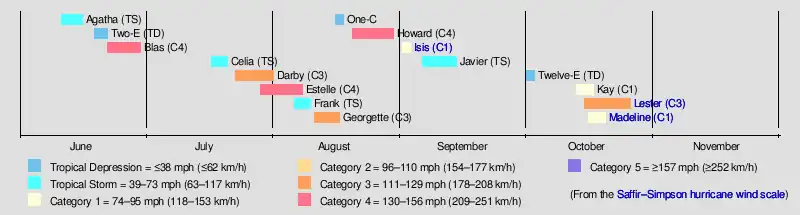 The 1998 Pacific hurricane season was a fairly average Pacific hurricane season. Despite this, it had nine hurricanes and six major hurricanes, which was well above average. The season officially started on May 15 in the eastern Pacific and on June 1 in the central Pacific, and ended on November 30; these dates conventionally delimit the period during which most tropical cyclones form in that region. The first tropical cyclone developed on June 11, about ten days later than the normal start of the season.[1] The final storm of the year, Hurricane Madeline, dissipated on October 20. Storm activity in the Central Pacific Hurricane Center's warning zone was low, with just one tropical depression observed in the region. Two tropical cyclones from the eastern Pacific (Darby and Estelle) also entered the central Pacific; the former did so as a hurricane.