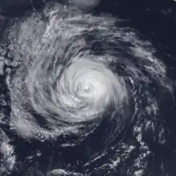 The depression tracked steadily northwestward, caused by its location along the western periphery of a subtropical ridge. It would retain that direction for most of its remaining duration. Late on August 11, it intensified into Tropical Storm Georgette, and two days later it attained hurricane status after developing a 40-mile (64 km) eye about 615 miles (990 km) south-southwest of Cabo San Lucas.[30] The eye became increasingly distinct while banding features became very well organized.[32] Georgette attained peak winds of 115 mph (185 km/h) while centered 690 miles (1,110 km) west-southwest of the southern tip of Baja California.[30] The hurricane soon moved over cooler water,[32] and began to weaken as convection warmed and decreased. On August 16, it degenerated into a tropical storm, and Georgette dissipated on August 17 without ever affecting land.[30]