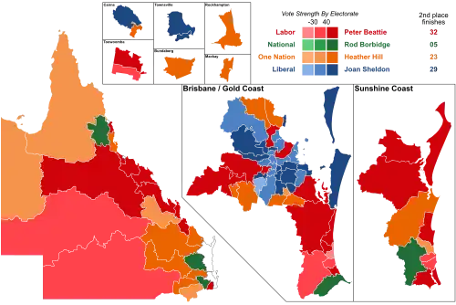 One Nation won 11 seats and finished second (after preferences) in 23 seats. Seven of One Nation's seats would have gone to Labor had it not been for leakage of Coalition preferences; had Labor won those seats, it would have been able to form government in its own right.[2]