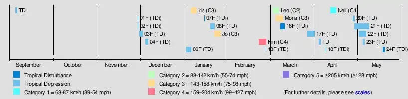 | 25 systems | September 5 – May 21 | 165 km/h (105 mph) | 935 hPa (27.61 inHg) | |||||