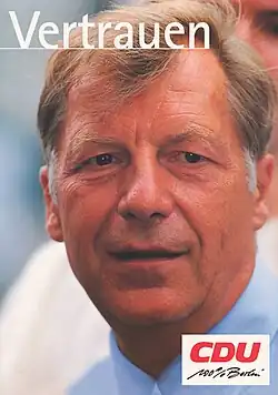 The 1999 Berlin state election was held on 10 October 1999 to elect the members of the 14th Abgeordnetenhaus of Berlin. The incumbent grand coalition between the Christian Democratic Union (CDU) and Social Democratic Party (SPD) retained government. CDU leader Eberhard Diepgen was re-elected as Mayor.[1][2][3]