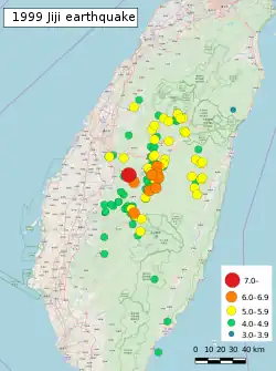 The Chi-Chi earthquake[5][6][7] (later also known as the Jiji earthquake[a], 921 Earthquake, or the great earthquake of September 21[b]), was a 7.3 ML or 7.7 Mw earthquake which occurred in Jiji (Chi-Chi), Nantou County, Taiwan on 21 September 1999 at 01:47:12 local time.[3] 2,415 people were killed, 11,305 injured, and NT$300 billion worth of damage was done. It is the second-deadliest earthquake in Taiwan's recorded history, after the 1935 Shinchiku-Taichū earthquake.