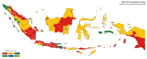 Under the New Order, only two political parties forcibly merged in 1973 – Indonesian Democratic Party (PDI) and United Development Party (PPP) – plus the functional group Golkar had been allowed to participate in elections.[1][2] With the start of the Reform Era, more than 100 new political parties emerged.[3] New elections were called for 1999 and 148 parties registered with the Ministry of Justice and Human Rights. Of these, only 48 passed the selection process, overseen by intellectual Nurcholish Madjid.[4][5] The elections were to be overseen by an independent General Elections Commission (KPU) of 53 members, one from each party and five government representatives.[6]
