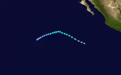 A tropical wave moved off the coast of western Africa into the Atlantic Ocean on August 29. It continued to move westward through the tropical waters of the Atlantic into the Caribbean. It still remained a tropical wave as it moved over Central America and began to acquire more convection and organization, from September 10 through September 11. Visible satellite imagery showed low level circulation and more organized deep convection as it became a tropical depression on September 17, while located about 475 miles (764 km) south-southeast of the southern tip of the Baja California Peninsula.[30]