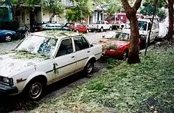A study of samples taken of affected areas suggested that roughly 62% of buildings in the affected areas suffered damage to roofs, around 34% to windows and 53% to vehicles.[12] Construction of infrastructure for the 2000 Sydney Olympics in the city's west at the time meant there was a deficiency of tradespeople who could be contracted to repair roofs and windows. Estimates put between 45,000 and 50,000 tradespeople in Sydney at the time of the storm, yet owing to high demand "companies were quoting householders A$14,000 or more for roof repairs which would normally cost $3,000."[26] The situation led to a warning from the Minister for Fair Trade, John Watkins, on the day following the storm, urging homeowners to ensure that tradespeople working to repair homes were fully qualified and legitimate.[29]