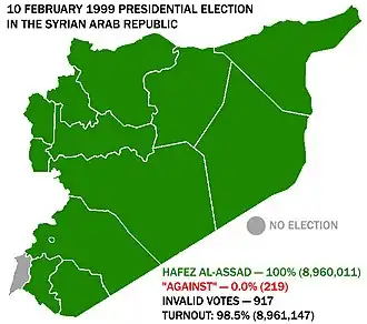 Presidential elections were held in Syria on 10 February 1999.[1] There was only one candidate, incumbent president Hafez al-Assad, with voters asked to approve or reject his candidacy. A reported 100% of voters voted in favour, with a turnout of 98.5%.[2] Assad was re-elected for another seven-year term. However, he died in June 2000, resulting in an early presidential election that year.