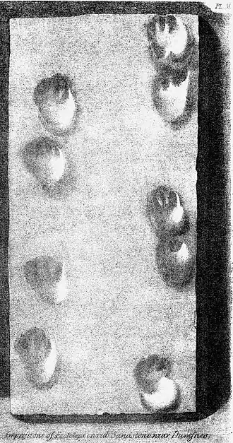 - Fossil footprints were reported from Cheshire, England in Triassic rocks known at the time as the New Red Sandstone. This is the earliest written record of fossil footprints now referred to the ichnogenus Chirotherium.[10]