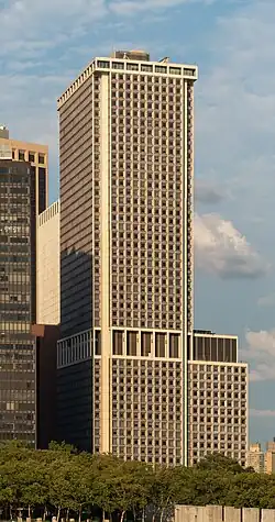 1 New York Plaza is an office building in the Financial District of Manhattan in New York City, at the intersection of South and Whitehall Streets near South Ferry. The building, measuring 640 feet (200 m) tall with 50 floors, is the southernmost skyscraper in Lower Manhattan. It was designed by William Lescaze & Assocs. and Kahn & Jacobs, and developed by Sol Atlas and John P. McGrath.[1]