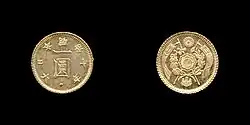 The first Japanese one-yen coins were minted between 1871 and 1872 using both silver and gold alloys.[1][2] This came at a time when a new decimal system was put into place, and a modern mint was established at Osaka. The yen was officially adopted by the Meiji government in an act signed on June 27, 1871.[3] While silver one yen coins are dated 1870, this indicates their mintage date at the San Francisco Mint as the coins were not issued until the following year.[1][4] Gold one yen coins dated 1871 were not minted until 1872 at the newly formed Osaka mint.[2] No silver one yen coins were struck in 1873 as the year was devoted to turning out gold pieces domestically.[5] The exclusive minting of gold coins during this time was reflective of the Japanese government's wish to switch to the gold standard in order to keep up with countries in North America and Europe.[6] The Japanese government eventually came to the conclusion that issuing silver one yen coins alongside standard gold coins was in the best interest of foreign trade. Silver one yen coinage was resumed in 1874 for use outside of Japan to compete with the silver Mexican dollar.[7]
