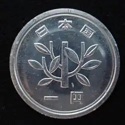 Japanese coinage was reformed in 1948 with the issue of a brass one-yen coin. 451,170,000 coins were minted until production stopped in 1950.[18] The obverse of these brass coins features a numeral "1" with "State of Japan" above, and the date below, while the reverse reads "One Yen" with a floral pattern below it.[18] The current aluminum coin was first introduced in 1955 with a floral design. The obverse has a young tree, intended to symbolize the healthy growth of Japan. The reverse side of the coin has a figure "1" in a circle that represents one yen; below the digit is the year of issue which is written in kanji.[19] The one yen coin remains the oldest modern denomination coin with an unchanged design; throughout its minting history during the Showa era the coin was fully halted only once in 1968 due to excessive production.[20][19][21] In 1989 a national consumption tax (set at 3%) was put into place resulting in many prices that were not multiples of 5 or 10 yen, causing the Japan Mint to produce one yen coins in huge amounts.[21][22]