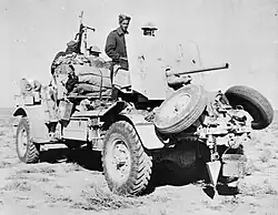 During February, elements of 2nd Armoured Division were sent up piecemeal to Cyrenaica to relieve 7th Armoured Division, which had been in contact with the Italians for eight months without rest.[10][17] After desert training 3rd Armoured Brigade moved up on 26 February as an independent brigade group with 9th RB attached. The battalion's first task was peacekeeping between the local Arabs and the Italian settlers. Then on 22 March it took over the front at Mersa Brega, some 150 miles (240 km) south of Benghazi.[18][19]