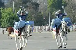 In 1999, the regiment was relocated to its current stables in Camp San Isidro in the western city of Quillota, Valparaíso Region, wherein it was reassigned the duties of being the travelling escort to the President, merging the Mounted Ceremonial Troop to it.[2] Today it maintains the primary purpose of protocol and ceremonial public duties as the most senior regiment of cavalry of the modern day Chilean Army, and one of only 2 regiments left standing in the role of mounted cavalry. Alongside being the travelling escort unit, it maintains guards at the Plaza de la Ciudadanía in Santiago monthly for flag raising ceremonies held there. The regiment's change of command ceremony is the only one in the army wherein most of it is done while mounted, reflecting the long traditions of the Chilean Army cavalry.[3]