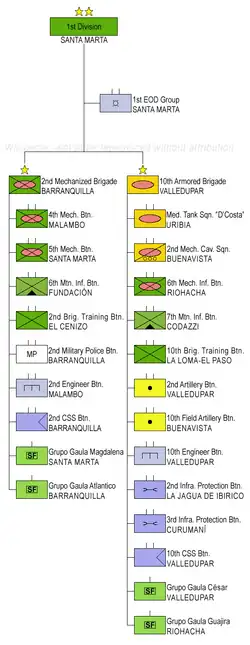 Currently, the 1st Division has two units under its command: the 2nd Brigade and the 10th Armored Brigade, with a total strength 20,000 soldiers; it is responsible for the Colombian departments of Atlántico, Magdalena, Cesar, La Guajira and southern Bolívar.[2]