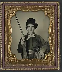In the spring of 1861, various Mississippi cavalry companies volunteered for military service and traveled to Tennessee, including the Pontotoc Dragoons, an prewar volunteer company dating back to the time of the Mexican-American War.[1] Other cavalry companies from Mississippi, including the Noxubee Cavalry, Thompson Cavalry, and Bolivar Troop were organized into the 1st Battalion Mississippi Cavalry at Union City, Tennessee by Captain John H. Miller of the Pontotoc Dragoons. The Battalion mustered into Confederate service on June 2, under the command of General Benjamin F. Cheatham.[2][3] The Battalion was sent to New Madrid, Missouri, and fought in a skirmish at Bird's Point, Missouri on October 14 and the Battle of Belmont on November 7.
