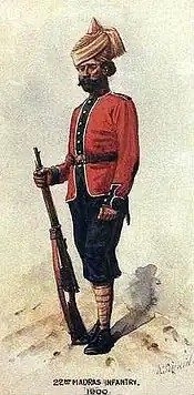 The 1st Punjab Regiment had its antecedents in the old Madras Army of the British East India Company, which was largely responsible for the establishment of British rule in south and central India. Its senior battalion was raised as the 3rd Battalion of Coast Sepoys in 1759, making it the senior-most surviving infantry battalion of the British Indian Army. The 2nd Battalion was raised in 1761 as the 7th Battalion of Coast Sepoys, while the 3rd Battalion was raised in 1776 as the 16th Carnatic Battalion. This was followed by the 5th Battalion in 1788 as 29th Madras Battalion and the 10th Battalion in 1794 as 34th Madras Battalion. These battalions underwent several changes in nomenclature until 1824, when they were designated as the 2nd, 6th, 16th, 22nd and 24th Regiments of Madras Native Infantry. Their men were mostly enlisted from South India and consisted of Muslims and Hindus. The 4th Battalion was an oddity as being a survivor of the Bengal Army, most of whose units were disbanded following the Indian Rebellion of 1857–58. It was raised in 1776 as the 30th Battalion of Bengal Sepoys. In 1861, it was designated as the 1st Regiment of Bengal Native Infantry. It mostly recruited Hindu Brahmans from Oudh.[1]