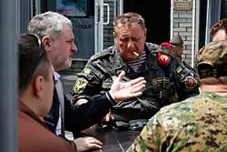When the 1st and 2nd battalions were established, they received small arms but after the events during the Battle of Ilovaisk in August 2014, the battalion received armored personnel carriers, infantry fighting vehicles and heavy infantry weapons.[14] On 28 August 2014, during the Battle of Debaltseve, the retreating convoy including that of the brigade was ambushed by separatists killing five soldiers (Fedir Valeriyovych Ukharskyi,[27] Andrii Ivanovych Tyshchenko,[28] Mykola Mykolayovych Matvienko,[29] Kurmashev Oleksiy Vasyliovych[30] and Doga Oleg Vyacheslavovych[30]) of the brigade and wounding 19 more.[31] In August 2014, Arsen Avakov stated that ten thousand law enforcement officers were engaged in the ATO zone including volunteers such as those of the battalion.[32] Andrii Antonyshchak noted:
