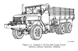 The 2+1⁄2-ton, 6×6 truck was a standard class of medium duty trucks, designed at the beginning of World War II for the US Armed Forces, in service for over half a century, from 1940 into the 1990s.[nb 1] Also frequently known as the deuce and a half, or just deuce, this nickname was popularized post WWII, most likely in the Vietnam War era.[2] The basic cargo versions were designed to transport a cargo load of nominally 2+1⁄2 short tons (5,000 lb; 2,300 kg) over all terrain, in all weather. The 2+1⁄2-ton trucks were used ubiquitously in World War II, and continued to be the U.S. standard medium duty truck class after the war, including wide usage in the Korean and Vietnam Wars, as well as the first Gulf War.