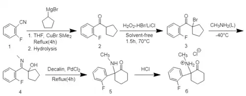 - ^ a b c d Moghimi A, Rahmani S, Zare R, Sadeghzadeh M (July 18, 2014). "Synthesis of 2-(2-Fluorophenyl)-2-methylamino-Cyclohexanone as a New Ketamine Derivative". Synthetic Communications. 44 (14): 2021–2028. doi:10.1080/00397911.2014.885053. S2CID 98475552.