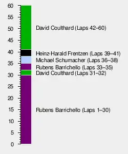 Michael Schumacher, no longer hampered by Villeneuve,[81] took the race lead after Barrichello retired and set a new fastest lap of the race on lap 36, a 1:26.797, pulling out a gap before his pit stop by lapping a second quicker than the field.[84][86][94] Zonta retired on the next lap after spinning into the gravel trap at the exit of Stowe circuit due to a driver error that sent him wide.[69][85][88] Michael Schumacher made a 8.8-second pit stop on lap 38, promoting Frentzen to the lead.[87] He returned to the track in sixth,[81][94] ahead of Villeneuve.[85] The Jordan driver made a pit stop on lap 42 handing the lead back to Coulthard.[86] The Williams pair both made pit stops over the next two laps, promoting Häkkinen and Michael Schumacher into second and third positions.[86] Michael Schumacher was unable to catch Häkkinen due to slower drivers impeding him.[84] Herbert was the final driver to make a planned pit stop on lap 48, allowing his crew to re-pressurise his car's hydraulic pressure system.[84][88] When lap 49 ended with the scheduled pit stops completed the top six drivers were Coulthard, Häkkinen, Michael Schumacher, Frentzen, Ralf Schumacher and Button.[89] Häkkinen started to gain on Coulthard on lap 51 who had a minor gearbox issue caused by a technical fault.[69][86][95] Coulthard felt the problem but was not alerted of its seriousness by his race engineer Pat Fry over radio.[92] On the same lap, Frentzen began to slow due to a gear selection issue, forcing him to drive in sixth gear, dropping behind Ralf Schumacher and Button.[88]