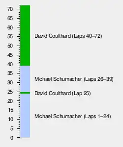 Coulthard went to the inside of Michael Schumacher (who had heavily worn tyres) in the Adelaide hairpin as Schumacher steered wide to cover. After forcing Michael Schumacher into the outside verge of the corner exit, he took the lead on lap 40.[5][51][52] Michael Schumacher's right front wheel made slight contact with Coulthard's left rear tyre exiting the hairpin.[48][52] Michael Schumacher then promptly withstood Häkkinen's overtaking attempts.[52] Frentzen and de la Rosa became the next two drivers to make pit stops on the same lap.[53] Michael Schumacher and Häkkinen made pit stops for the second time on lap 43 and both emerged in third and fourth respectively. Barrichello's pit stop on the 44th lap lasted 16.8 seconds and dropped him to fifth because his team had trouble fitting a cross threaded wheel nut on his right front tyre.[49][51] This eliminated Barrichello from contention for the victory.[57] De La Rosa retired in the pit lane with transmission failure after completing 45 laps.[52][53] Coulthard entered the pit lane at the conclusion of the 46th lap for his final 7.9-second pit stop. He rejoined in the lead, three seconds ahead of Michael Schumacher.[51]